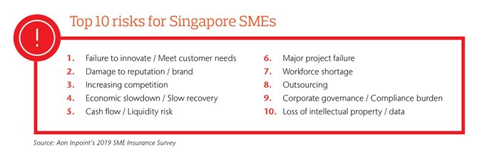 Failure to innovate tops the list of risks faced by Singapore SMEs. The adoption of technologies such as Artificial Intelligence, drones, and advanced robotics have made SMEs vulnerable to new threats. With the speed of change in the global economy, these risks are becoming more unpredictable and SMEs find it difficult to prepare for them.
