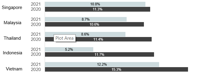 Voluntary turnover in 2021 remained either mostly flat or declined, as reported in Singapore (from 11.3 percent in 2020 to 10.8 percent in 2021) and Malaysia (from 10.6 percent in 2020 to 8.7 percent in 2021), demonstrating there is hesitation in switching employers amid an uncertain business landscape.