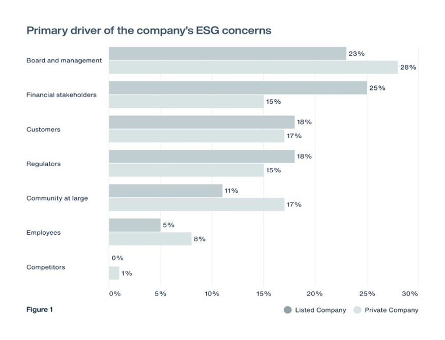 - 25 percent of private companies and 50 percent of listed companies have a dedicated ESG team.
