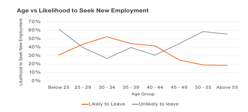 The report highlighted that 40 percent of employees, under 29 years old, and 53 percent of those ranging from age 30-34 are considering seeking new employment within the next 12 months. Furthermore, the report also found that 51 percent of employees who have worked for three to five years are also considering changing jobs in the coming year. These groups include workers involved in execution roles and mid-level managers with several years of experience and institutional knowledge, whose potential departure could affect business continuity and productivity.