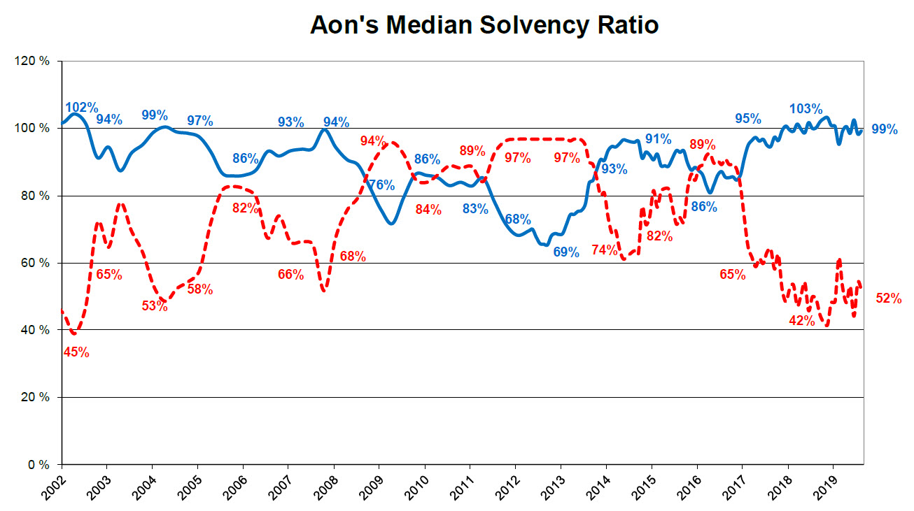 - Aon’s Median Solvency Ratio increased by 0.8 percentage points in the second quarter of 2019, to 99.3% from 98.5% in Q1.
