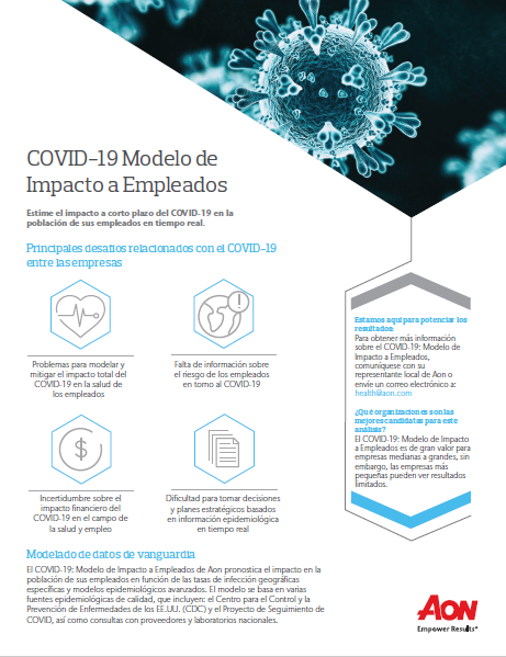 Además de proporcionar sus resultados de impacto por COVID-19 en tiempo real, Aon puede ayudarle a aprovechar los datos para tomar decisiones estratégicas en torno a su fuerza laboral, incluidos los costos de beneficios, tiempo libre y vacaciones pagadas. El modelo tiene una amplia aplicabilidad y su funcionalidad y alcance aumenta rápidamente con el tiempo.