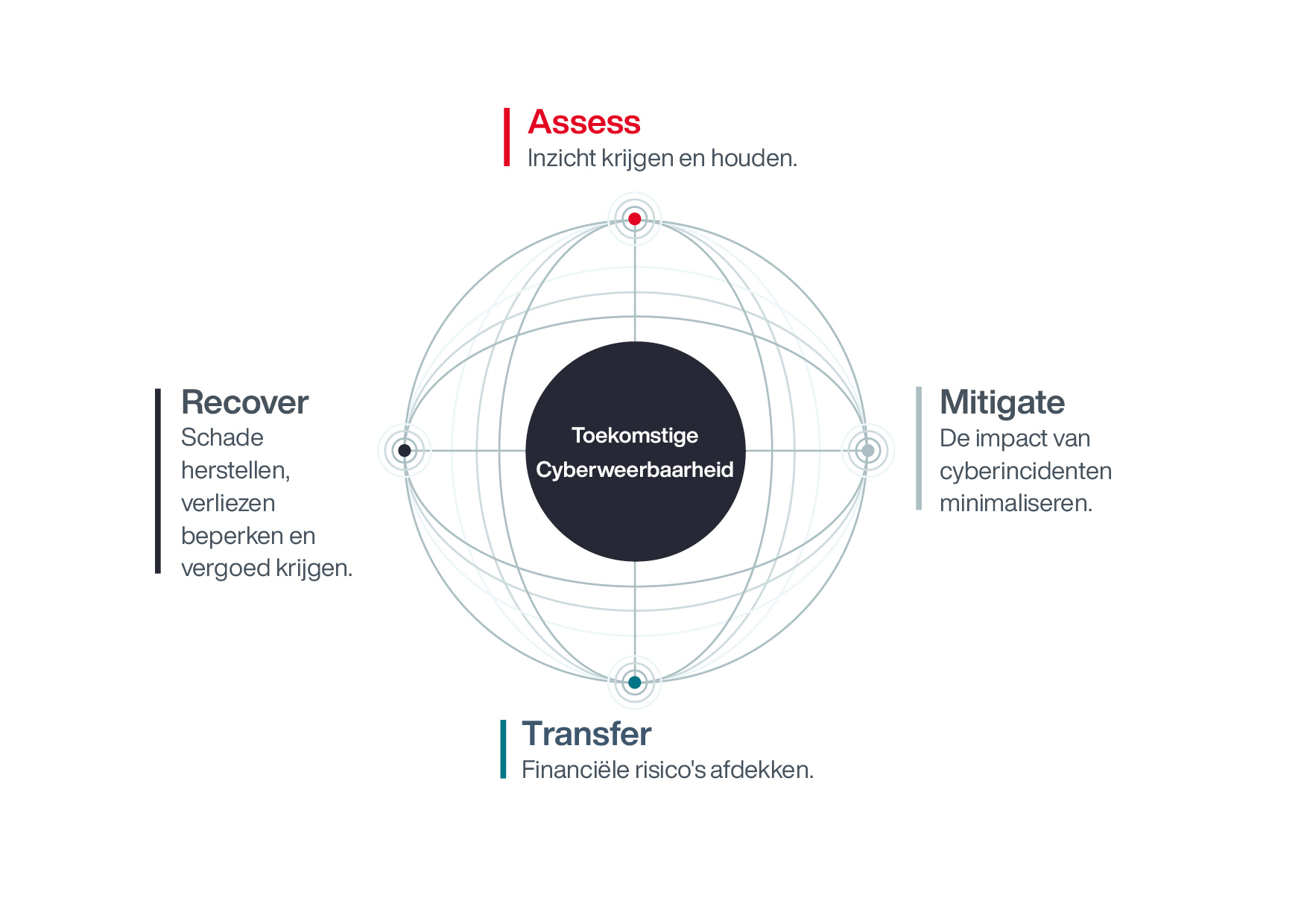 Om een raamwerk voor cyberweerbaarheid voor uw organisatie op te bouwen beoordeelt Aon cyberweerbaarheid op vier essentiële gebieden: