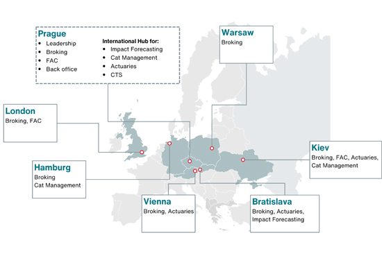 Aon Reinsurance CEE team operates in locations Prague, Bratislava, Hamburg, Kiev, London, Vienna and Warsaw. We ensure that every client, irrespective of his geographic location, receives the full capabilities of our global firm. To enhance our local content with clients, the team is fluent in Czech, English, Polish, German, Ukrainian and Slovakian (and other languages) as it operates on Austrian and CEE market.