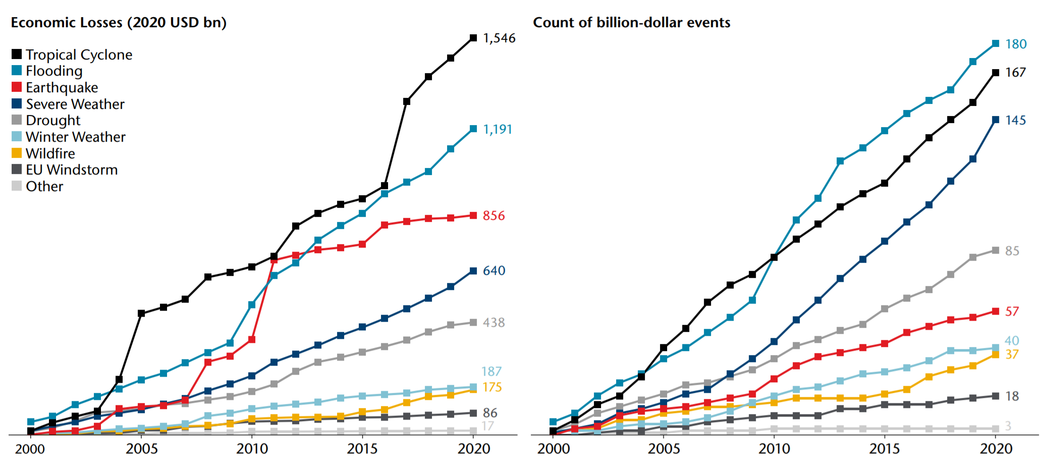 Climate change is already exacting a substantial economic cost to societies. Aon estimates that weather disasters attributable to atmospheric change (such as tropical cyclones, flooding, drought and wildfires) caused US$268bn of economic losses globally in 2020, 10% above 21st century average . In the 21st century the annual losses have been rising inexorably, with damage from cyclones and flooding increasing at an accelerated pace (see chart).