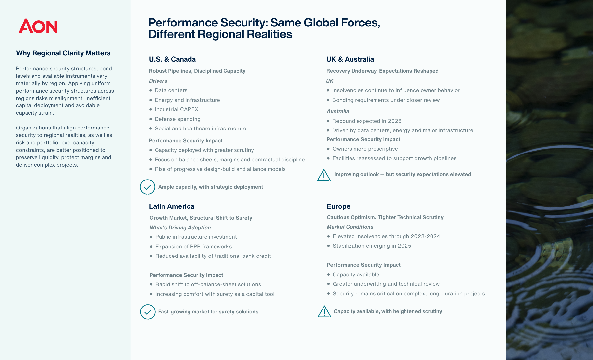 Organizations that align performance security to risk, regional realities and portfolio‑level capacity constraints are better positioned to preserve liquidity, protect margins and deliver complex projects as scale continues to increase.