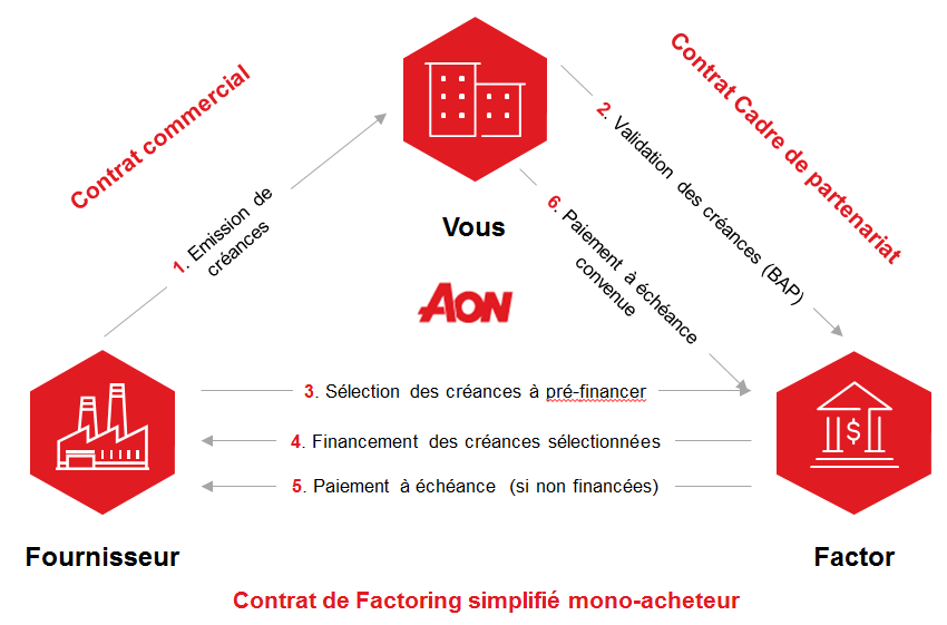 La société externalise tout ou partie de ses achats auprès de ses fournisseurs. Le métier de ces prestataires est d’acheter sur ordre et pour le compte de la société auprès des fournisseurs. Les relations financières contractuelles définies entre la société et le fournisseur s’imposent au prestataire : la société conserve le sourcing, référencement, négociation tarifaire, etc. Le prestataire s’engage auprès de la société à régler ses fournisseurs à la date d’échéance contractuellement établie et accorde un délai supplémentaire à la société (portage de facture).