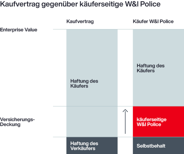 Während bei einem üblichen Kaufvertrag der Verkäufer die Garantien abgibt (z.B. zu Arbeitnehmern, wesentlichen Verträge, Steuern etc.) und für etwaigen Garantieverletzungen gegenüber dem Käufer haftet, ist die Situation im Rahmen eines Kaufvertrages unter Einbeziehung einer W&I-Versicherung anders gelagert. Kommt eine W&I-Versicherung zum Einsatz, gibt der Verkäufer zwar noch immer Garantien ab, beschränkt seine Haftung aber auf EUR 1.- gegenüber dem Käufer. Im Falle einer Garantieverletzung ist somit der Anspruch des Käufers gegen den Verkäufer nicht werthaltig.