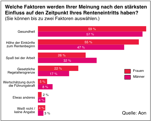 Ausschlaggebend für eine finale Entscheidung über die Verlängerung der Arbeitszeit sind vor allem die Gesundheit (Frauen 59 Prozent, Männer 57 Prozent) und das eigene Einkommen (Frauen 55 Prozent, Männer 47 Prozent). Dabei spielen bei Frauen die Finanzen eine noch größere Rolle als bei Männern. „Auch dies ist ein möglicher Ansatzpunkt für Arbeitgeber, um die eigenen Mitarbeiter:innen länger zu halten“, erläutert Stephanie Zelosko, Senior Consultant bei Aon. „Egal ob betriebliche Gesundheitsförderung, Angebote zur betrieblichen Krankenversicherung oder die Gewährung einer Betriebsrente – es gibt viele Anknüpfungspunkte für Arbeitgeber, um die maßgeblichen Faktoren für den Renteneintritt ihrer Mitarbeiter:innen zu adressieren. Auch differenzierte bzw. zielgerichtete Angebote für Frauen und Männer können attraktiv und sinnvoll sein, z.B. mit Blick auf die Unterstützung der finanziellen Sicherheit im Alter.“