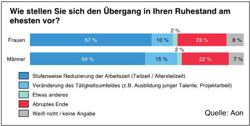 Der Großteil der befragten Arbeitnehmer:innen wünscht sich einen gleitenden Übergang in den Ruhestand. 67 Prozent der Frauen und 69 Prozent der Männer bevorzugen eine stufenweise Reduzierung der Arbeit bzw. ein verändertes Tätigkeitsumfeld im Unternehmen. Davon erhoffen sich mehr als die Hälfte der Befragten vor allem weniger Stress (Frauen 58 Prozent, Männer 52 Prozent). Außerdem wichtig für die ruhestandsnahe Lebensphase sind den Arbeitnehmer:innen eine kürzere Arbeitszeit (Frauen 54 Prozent, Männer 50 Prozent), mehr Flexibilität (Frauen 45 Prozent, Männer 44 Prozent) sowie weniger körperliche Belastung (Frauen 41 Prozent, Männer 35 Prozent).