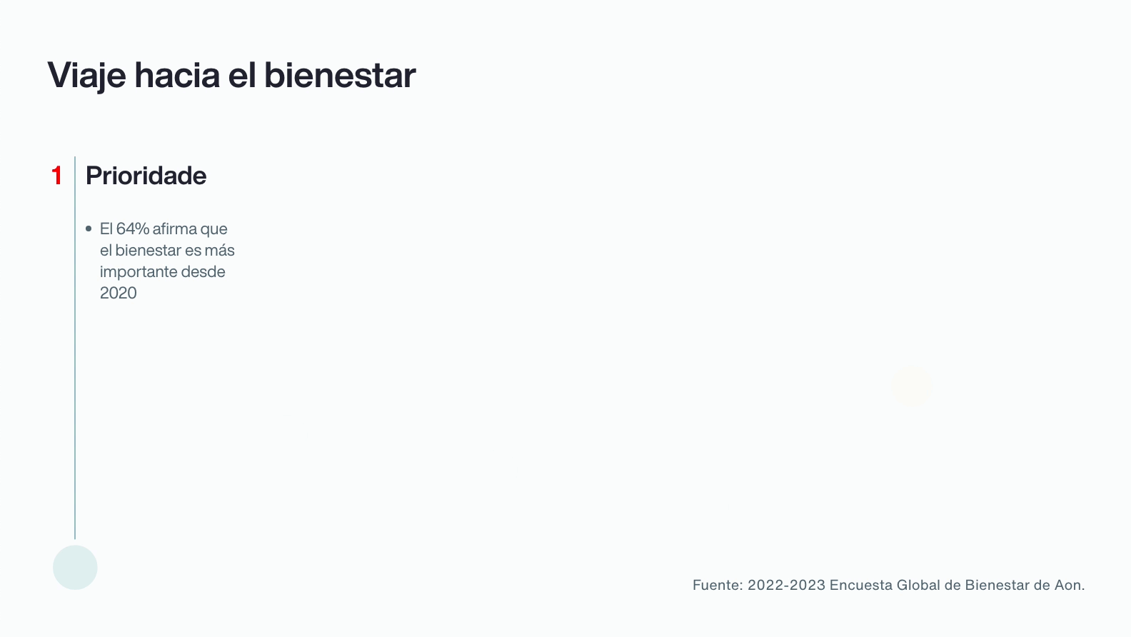 Obtenga más información sobre el estado actual del bienestar, incluidos los aspectos más destacados por región, descargando la Encuesta Global de Bienestar 2022-2023. Consúltenos sobre las soluciones disponibles de Aon que pueden ayudarle a obtener información valiosa para fundamentar mejor sus decisiones sobre bienestar.