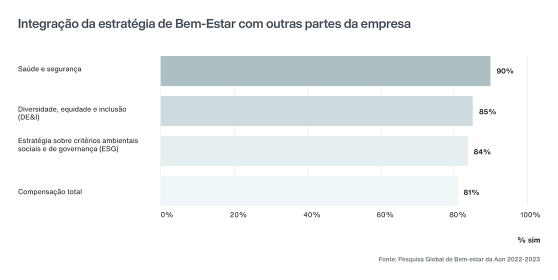 Como parte de sua estratégia de bem-estar, mais de 80% das organizações incluíram elementos de diversidade, equidade e inclusão (DE&I); critérios ambientais, sociais e de governança (ESG); saúde e segurança e programas de recompensas totais.