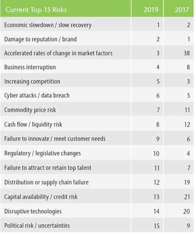 Η Παγκόσμια Έρευνα για την Διαχείριση Κινδύνων 2019 της Aon, που πραγματοποιείται κάθε δύο χρόνια και απευθύνεται σε χιλιάδες Risk Managers οι οποίοι δραστηριοποιούνται σε 60 χώρες και 33 κλάδους, ανέδειξε τον Επιταχυνόμενο Ρυθμό Μεταβολής των Παραγόντων της Αγοράς, την Οικονομική Επιβράδυνση και τις Τιμές των Βασικών Εμπορευμάτων, ως τους τρεις κορυφαίους κινδύνους για τις ευρωπαϊκές επιχειρήσεις.