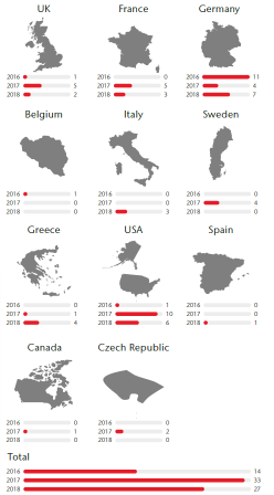 Στην Ελλάδα, ο αριθμός είναι αρκετά μικρότερος σε σχέση με την Γερμανία, είναι όμως αξιοσημείωτο το γεγονός ότι το 2018 οι επιθέσεις και οι απόπειρες που εμποδίστηκαν ήταν 4, ενώ το 2016 ήταν 0.