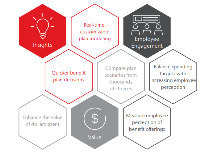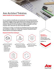 Aon Architect is a patented,1 data-driven solution that blends employer financials with employee perception. Aon Architect analyzes roughly 500,000 client-specific scenarios, and allows you to create and modify your own scenarios. The tool measures employee perception using proprietary data and advanced statistics, and uses machine learning to predict employee plan selection behavior.