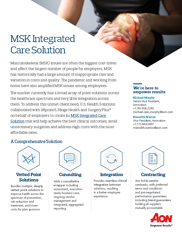 The market currently has a broad array of point solutions across the healthcare spectrum and very little integration across them. To address this unmet client need, U.S. Health Solutions collaborated with 98point6, Hinge Health and SurgeryPlus® on behalf of employers to create its MSK Integrated Care Solution that will help achieve the best clinical outcomes, avoid unnecessary surgeries and address high costs with the most affordable rates.
