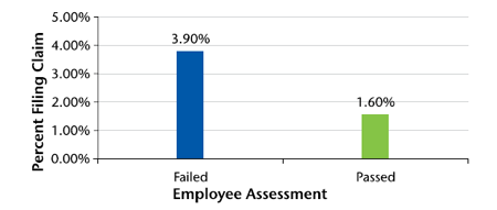Reflecting upon Aon Hewitt's recent projects, it was found that a high scoring applicant (high score on a job relevant assessment, therefore a better fit) during a pre-assessment test was twice as productive as the low scorers. Moreover, the low scorers were also twice as vulnerable to on-the-job accidents as compared to the high scorers as depicted in the graph below.