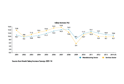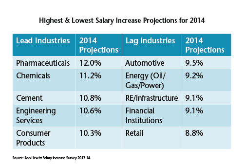 Sectors largely reliant on domestic economy such as pharmaceuticals, chemicals, engineering services and consumer goods, are projecting the highest salary increases, typically above 10% for 2013-14. In these industries, compensation costs represent a smaller percentage of the total cost structure. However, the cautious streak is evident as projections for 2014 have reduced by an average of 30 basis points from the actual increases provided in 2013 by these industries.
