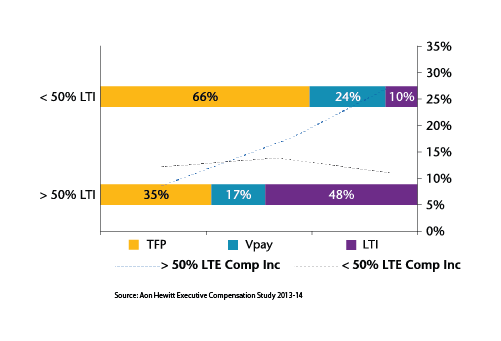 In the current year, we noted a far greater focus on long-term pay than on annual incentives - while certain industries such as banking have had regulatory requirements drive this change, a wide variety of other industries also seem to be adopting a greater focus to incentives being delivered over 3-4 years than through annual incentives. In fact, the study noted a direct correlation between higher compensation increases and higher mix of short and long-term variable components in pay. This is presented in the chart below.