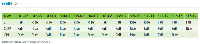 Exhibit 2 above summarizes the direction of movement of salary increases vis-à-vis movements in macroeconomic indicators.