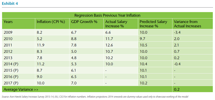 Exhibit 4 above presents the regressed values on salary increases for past years as well as a prediction for the future using CPI