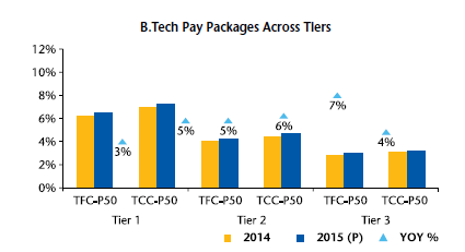While the engineering colleges are churning high number of graduates and the industry is picking up talent in large volumes, the year-on-year increase on both the anchors is ranging from 3% to 7% across tiers. Similar trend is seen each year with flat or not so drastic changes in the pay packages at engineering campuses.