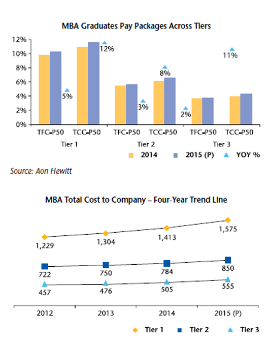 The positivity also resonates in the pay packages offered in campuses. 2015 will witness some of the highest compensation offered to students. Pay package is one of the simplest yet effective levers to attract students, and sectors like consumer products and e-Commerce are using this to their advantage to hire the best talent. The overall MBA Tier 1 median on total cost to company has increased by 12% in 2015 as compared to last year, whereas the total fixed pay median has only increased by 5%. This shows companies are adopting smarter ways to design pay packages at campuses, with minimal increase in fixed pay component and substantially increasing one time payouts such as joining bonus or increasing the variable pay component to link performance and pay aggressively at the start of student careers. By increasing the TFP nominally and TFC substantially (by increasing / introducing one time payout of joining bonus/ completion bonus), companies are able to maintain year-on-year on MBA batch parity and salary differential.