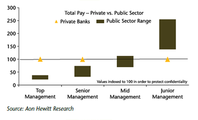 than an average private sector bank employee. At senior and top management levels, pay lags significantly with