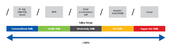 Traditionally, organizations have used the pay range to position skills with a demand supply mismatch at the higher end of the range. With technology cycles panning over considerable time frames, this let organizations hire, and manage talent towards the max of the range while allowing for gradual deceleration as the technologies cooled down. Organizations that were innovators would train resources on the emerging technologies and accelerate their positioning in the range through disproportionate funding of base pay increases as skill proficiency and business demand increased. Organizations that looked to buy talent would position talent in the higher end of the range and continue to increase exit barriers through higher than average increases to these groups. Given range spreads of greater than 100% from commoditized skills to super hot skills in the market and the long gestation period of technologies in the past, the approach of increasing base pay has worked to a fairly ,mlarge extent in the past. However, now with technology Evaluation Criteria cycles becoming much shorter, positioning employees at the higher end of the spectrum just on the basis of skill and skill proficiency will lead to organizations not being able to gradually reduce the cost of skills which are cooling down and ramp up costs for skills which are heating up.