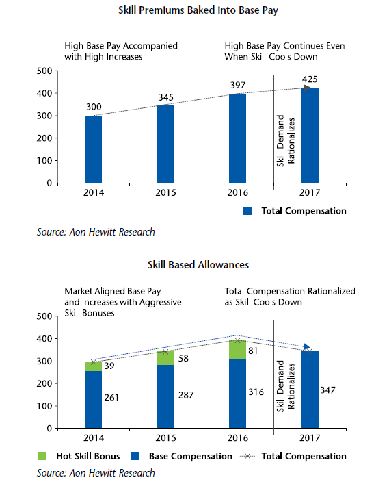 the organization the flexibility and agility to move its investments from one area to the other based on market demand and supply of skills. Some early adopters of this thought have moved towards incorporating skill-based compensation programs which are based on the demand and supply of skills and are over and above the base compensation of the employee. Essentially organizations are designing a STI program for employees with niche skills that reward the employee as long as the market is willing to pay a premium for the skills. From a pure affordability and expense perspective, it allows the organizations to be fairly agile in determining which pockets of the employee population need differentiated investments while at the same time not increasing the carry forward costs for employee groups. However, it is not as simple as it sounds, organizations need to embark on a significant change management journey to ensure that employees do not perceive it as an entitlement and organization can retain the right and the ability to remove the skill bonuses at their discretion.