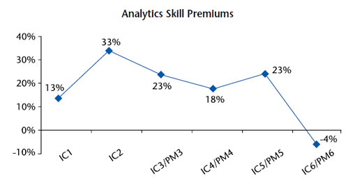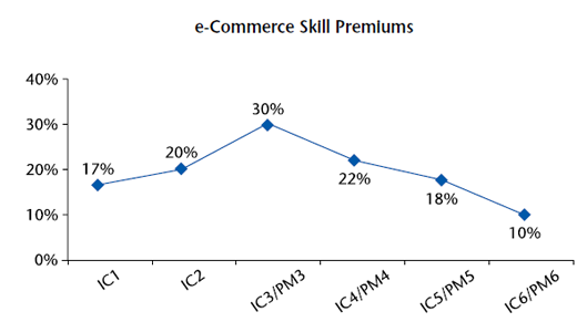 Most interestingly, we see the skill based differentiation peak at the senior individual contributor levels where you would expect large scale technology specialization. These organizations were building towards increasing the employees exit barrier as the proficiency levels of the employees increase. Surprisingly, after a certain level in the hierarchy the increasing trend of higher skill differentiation disappears. This is predominantly based on the fact that in large system integrators, the higher levels have a greater supply of business managers and project managers than technology specialists. However, given the intent that has been shared by multiple system integrators in public forums, the clear intent is to increase the no. of technology specialists that exist in the organization at the cost of the "general" managers. As we see this trend gain momentum, Aon Hewitt's point of view is that as these organizations build technology specialists, the trend of skill premiums increasing with hierarchy would become a lot stronger and would have much higher correlation.