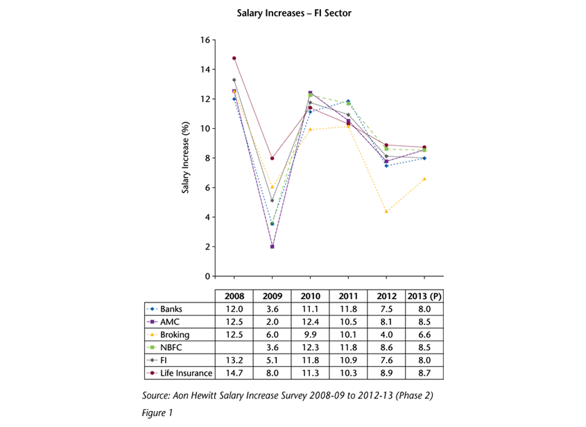 The Aon Hewitt Salary Increase Survey reveals that insurance along with banking is one of the most volatile industries in terms of average salary increases over the last few years. The survey mentions that over the last three years, the LI industry has witnessed a dip in the actual merit based salary increase in 2012-13. At 8.9%, which is by no means low, the numbers have gradually dropped over the last few years.