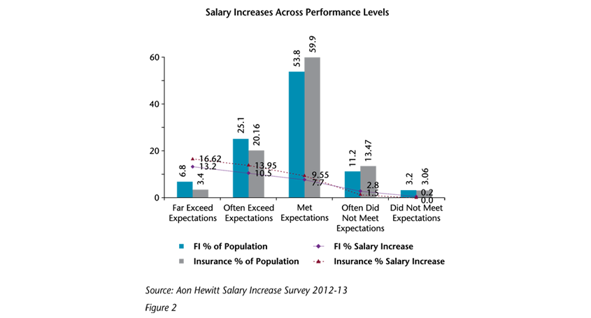 With organizations becoming focused on cost management, pay for performance as a concept is gaining a lot of acceptance in the LI world with CEOs and boards asking for a commensurate improvement in productivity as compensation levels go up. With limited budgets available, more and more organizations today are focusing on differentially rewarding their key talent and providing them with an accelerated growth path. When compared to overall financial institution, the performance distribution curve is steeper in case of insurance.