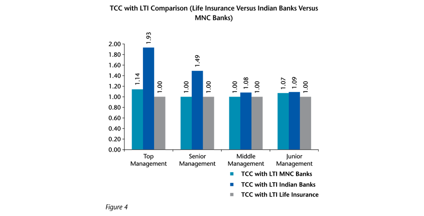 As can be evidenced by the graph (refer to figure 4), pay levels in insurance are lower than MnC banks in terms of fixed pay and lower than Indian banks in terms of total compensation.