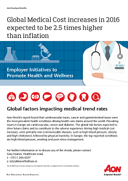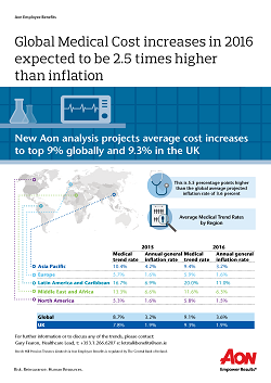 LONDON (14 January, 2016) - A new report from Aon Hewitt, the global talent, retirement and health solutions business of Aon plc (NYSE: AON), estimates that the average cost increases for employer-sponsored medical plans globally will be 9.1 percent in 2016. This is 5.5 percentage points higher than the global average projected inflation rate of 3.6 percent. In the UK, the increase in the costs of employer-sponsored plans is expected to rise by 9.3 percent.