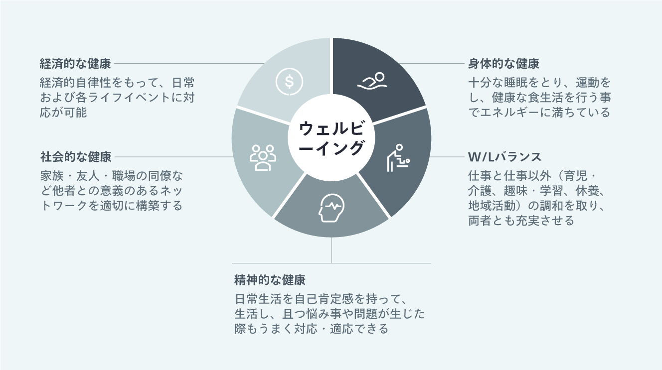 エーオンの2021年グローバル ウェルビーイング調査によると、「社員ウェルビーイングが4%向上した企業は、会社業績も1%改善する事」が明らかになっており、ウェルビーイングの全体方針・戦略の策定は企業の大きな課題になっています。ウェルビーイングは社会情勢の変化によって、多面的に捉える必要があります。また多様な人材に対するウェルビーイングの向上を図る為、画一的な福利厚生制度ではなく、柔軟な制度を用意する必要があります。
