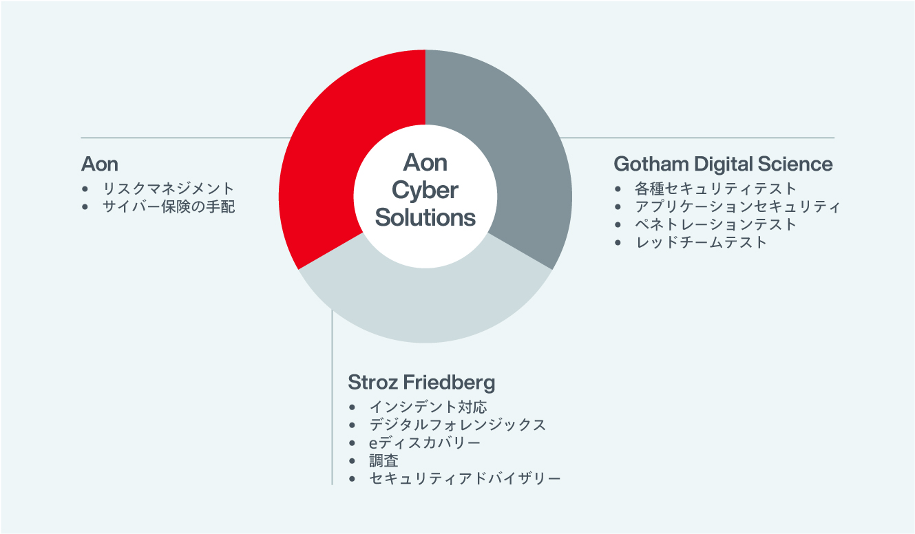 サイバーリスクは年々高まっており、全てのサイバー攻撃を防ぎきるのは困難だと言わざるをえません。エーオンでは、600名超の専門家を有し、サイバーリスクの評価、定量化、低減等のプレインシデントサービス、サイバー保険の手配およびインシデント対応体制構築支援までサイバーリスクに関するソリューションを一気通貫でご提供することが可能です。