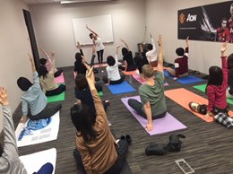 写真左:昼休みに実施される社員向けヨガセッションで気分もリフレッシュ