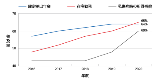 私傷病時の所得補償は現在60%の企業が導入しているものの、2016年は僅か43%であり、同様に、確定拠出年金は現在の64%に比べ当時は58%の企業においてしか導入されていませんでした。また、在宅勤務を導入していた企業は48%のみであり、また、その活用方法は非常に限定されていました。しかしながら、この数年の間、在宅勤務の普及率が拡大の一途を辿っており、新型コロナウイルス感染症によって更に後押しされた結果、普及率は65%にまで高まりました。