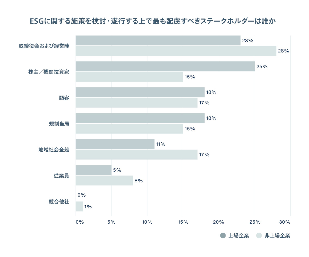 - 非上場企業の25%、上場企業の50%がESG専門のチームを設置