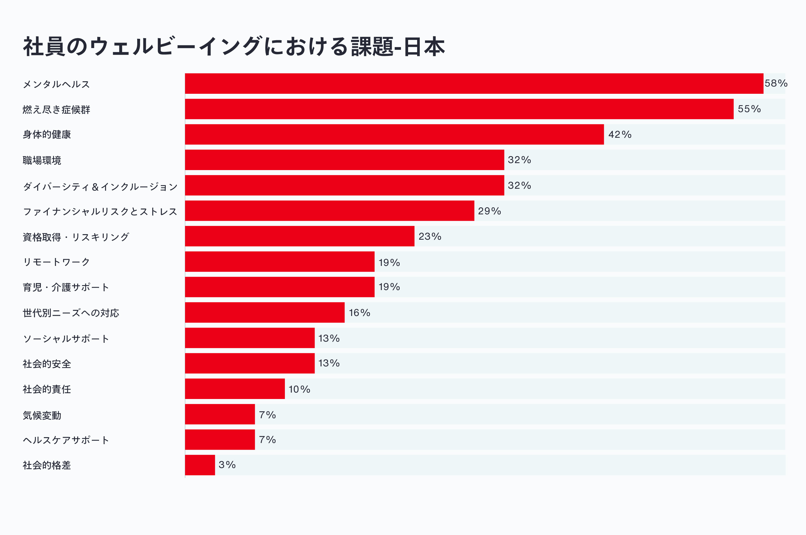 メンタルヘルスへの対応は、グローバル全体および日本企業の回答結果ともに、社員のウェルビーイングにおける課題の中で最も重要と回答されています。