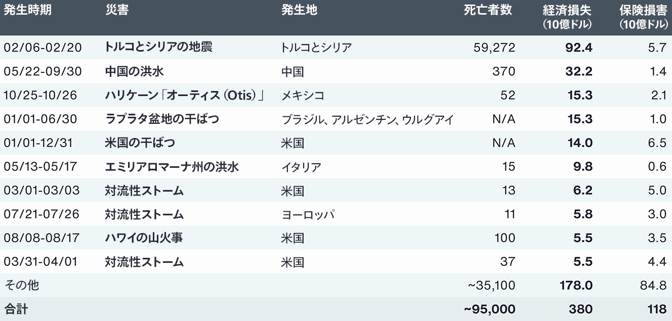 - 年刊の気候と大規模自然災害レポートは、2023年の大規模自然災害による経済損失が3,800億米ドルに達したことを示している