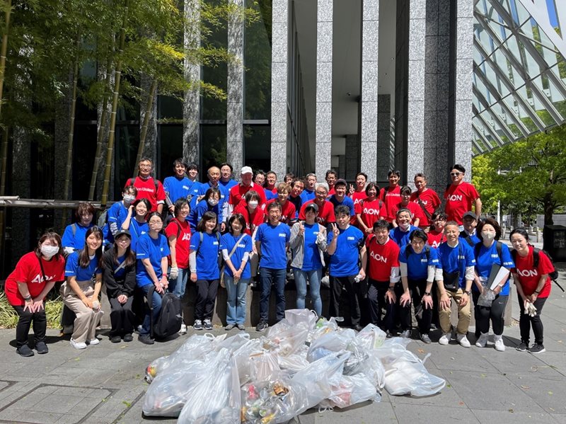 エーオン各国のオフィスでは、世界中の人々が気候変動に対する意識を高め、持続可能な社会の実現に向けて行動を起こすという共通の目標を掲げ、4月22日にアースデイを迎えました。地域社会の特徴に合わせた様々な取り組みが行われる中、日本では一足早い4月19日に、環境への影響を少しで軽減することを目的に、両社合わせて約50名弱の社員が街のごみ拾いに汗を流し、総計14キログラムのごみを回収いたしました。