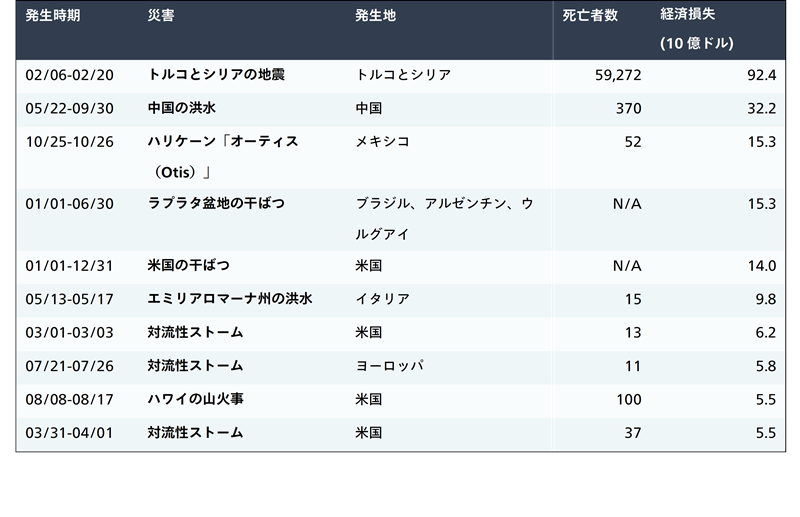 本レポートによると、2023年には世界全体で398件の自然災害が発生し、12ヶ月間の経済損失は21世紀の平均を22%上回る3,800億米ドル(2022年:3,550億米ドル)となりました。