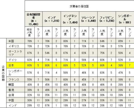 日本、2011年1月12日 – ジョブストリートとエーオン ヒューイット(米エーオン コーポレーション (NYSE: AON)のグローバル人事コンサルティング子会社)が共同で実施した調査の結果、東南アジアおよび南アジア地域に居住する求職者は、就職先として日本企業よりも欧米企業の方を好ましく感じていることが明らかになった。調査回答者の内、78%が米国企業を好ましい就職先として選択しており、次いで、イギリス、オーストラリア企業がランクの上位を占めた。日本企業の総合的な人気度は60%で、これは調査対象となった企業の国籍ランキングでは12カ国中第5位に相当する。