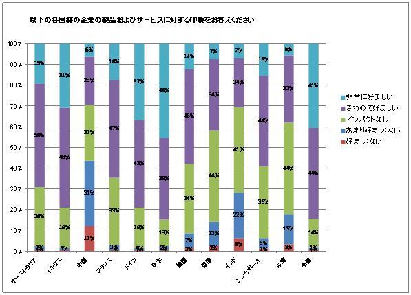 調査では、日本企業の製品およびサービスには全体の中で最も高い評価が与えられています。全有効回答者のうち45%が日本製品に対してきわめて好ましいという評価をしており、米国(41%)、ドイツ(37%)、イギリス(31%)、およびオーストラリア(19%)の評価を上回っています(図表 3 参照)。