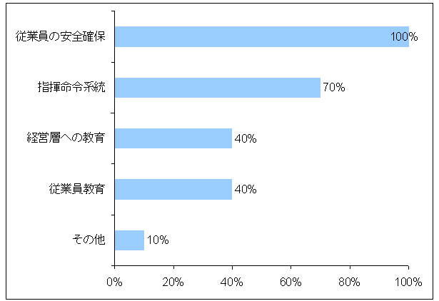 外国人社長の不安感が社員に伝わらないよう工夫し、社長のリーダーシップ発揮を日本人が支えることによって社内パニックを押さえたケースがありました。一方で、パニックに陥った外国人駐在員が勝手に帰国したり、一方的に情報を流したりといったケースもみられました。これらのことから、災害時における外国人社員の不安を取り除くための仕組みや外国人トップのリーダーシップ発揮、チームワーク作りの課題が浮き彫りになったといえます。