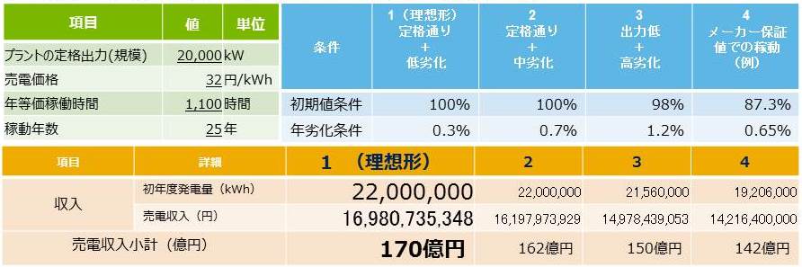 また、太陽電池モジュールの現状としては、公称最大出力が100%未満のモジュールが納品されているケースや劣化率が年率0.7%を