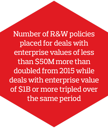 Despite the softening of premium rates, appetite by insurers for a broadening range of deals has grown, both from deal size (EV) and level of risk tolerance. Based on 2017 results, Aon experienced growth at both ends of the M&A market, noting that the number of R&W policies placed for deals with enterprise values of less than $50M more than doubled from 2015 while deals with enterprise value of $1B or more tripled over the same period. While R&W insurance has historically been known as a middle market solution, the expansion of the insurance market has created more opportunities to serve a wider class of deals.
