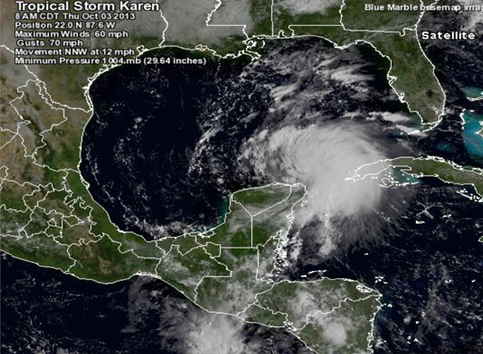 Se ha desarrollado la tormenta tropical “Karen” en el sureste del golfo de México, muy cerca de costas de Yucatán y Quintana Roo.
